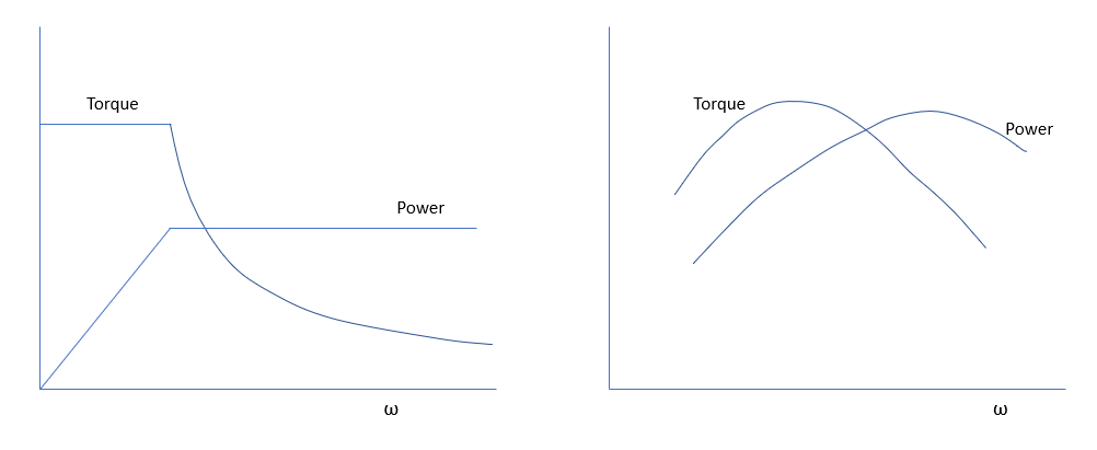 了解了種類之後,現在來談談電動車所表現出來的外在性能(撇開馬達種類的細節)。這包括加速、極速、爬坡力、與能耗。經常看到一些文章說到加速靠扭力而極速則是看馬力,這很容易讓人誤以為這是兩個完全不相關的數值。想像扭力是一匹馬經由放置在懸崖邊緣的滑輪去拖拉水泥塊的能力,馬力則是這匹馬能以多快的速度拖拉這懸吊的重物。所以大匹馬隻自然拖拉速度也就快也就是馬力大,而小匹馬則馬力小。所以馬力的基礎還是扭力,以公式來看(馬力P = 扭力T x 轉速ω)。引擎在轉速逐漸趨高時扭力會越過峰值開始下降,當扭力降幅大於增高的轉速在乘積上可以補償時,依照前面公式扭力與轉速相乘,馬力就會因汽缸內油氣混和達飽和後越過峰值開始下降,最後在無法超越坡度、風阻、與輪胎地面磨擦力後達最大轉速。而電動車的極速則是取決於馬達崩解扭力(breakdown torque)發生之前的最大轉速。所以馬力越大其極速也就會跟著拉高。不同的是,電動車馬力在扭力開始下降點一直到崩解扭力出現之前都是固定最大值,而燃油引擎會在馬力峰值過後隨轉速繼續增加開始下降。